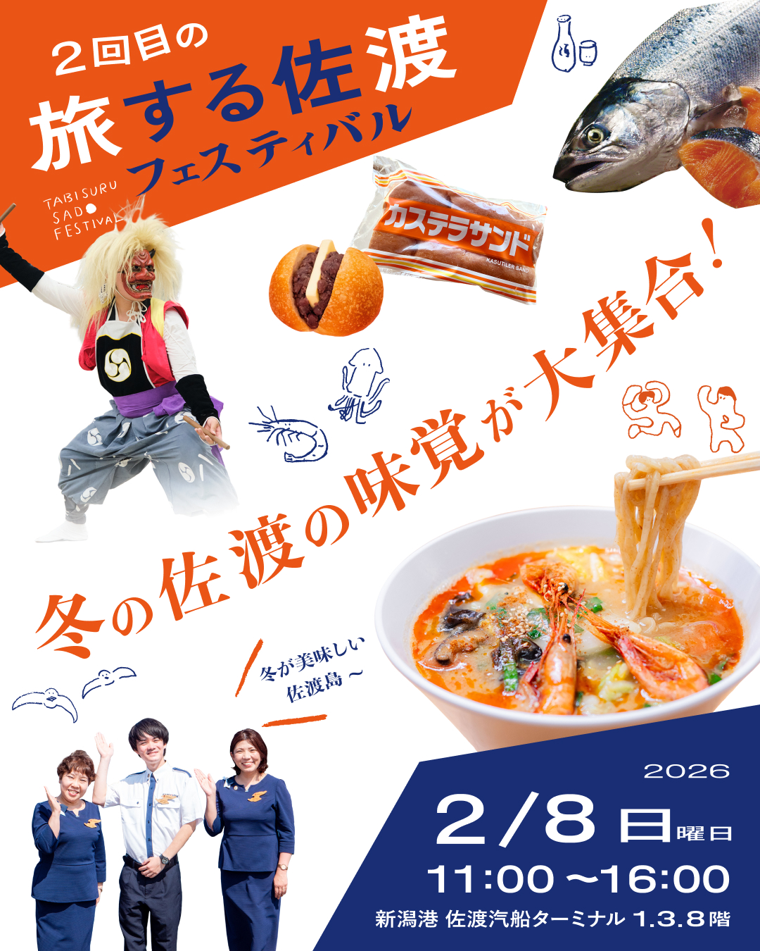 「旅する佐渡フェスティバル」2月8日(日)に新潟港で開催決定! 2026/01/09 イベント 旅する佐渡フェスティバル実行委員会(事務局:佐渡汽船株式会社)は、昨年6月に開催した佐渡旅の魅力を新潟で体感できる「旅する佐渡フェスティバル」第2回を2月8日(日)に開催します。 佐渡好きにはたまらないグルメや物販、鬼太鼓ステージなどの個性豊かなコンテンツが大集合。今回は、「海の幸」をメインに、心温まる人気のグルメが集まりました。 佐渡汽船ならではの特別プログラムもご用意しておりますので、ぜひご家族・ご友人とご参加ください。 1日限定で、普段入れないターミナルのエリアも開放!1階の貨物エリア一部と8階の元展望レストラン(現在は閉店)がにぎやかになります!会場は屋根付きなので、寒い冬のおでかけ先にぴったりです。 ■開催概要 「旅する佐渡フェスティバルwinter」 開催日:2026年2月8日(日)※雨天決行 開催時間:11:00~16:00 開催場所:新潟港 佐渡汽船ターミナル 1階・3階・8階 入場料:無料(一部有料コンテンツあり) 主催:旅する佐渡フェスティバル実行委員会 特別協力:佐渡汽船株式会社 あたたかい服装でお越しください! ※船舶の運航状況により、プログラムが変更となる場合がございます。 ■イベント詳細・最新情報は佐渡汽船公式Instagram 「旅する佐渡 powered by 佐渡汽船」@sadokisen_official にて随時発信! 【お問い合わせ】旅する佐渡フェスティバル実行委員会 事務局 (佐渡汽船株式会社 営業部内) 025-245-7511(平日8:30~17:00) eikikaku★sadokisen.com ★を@に変更し送信ください ニュース一覧