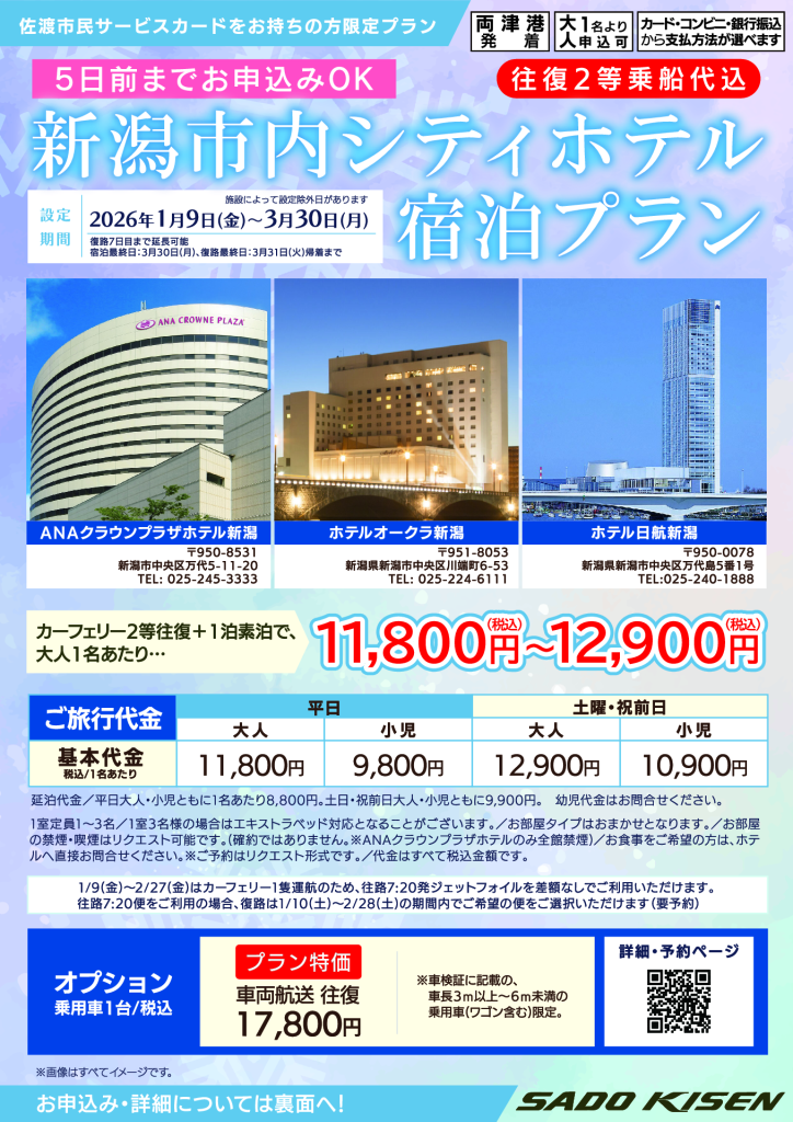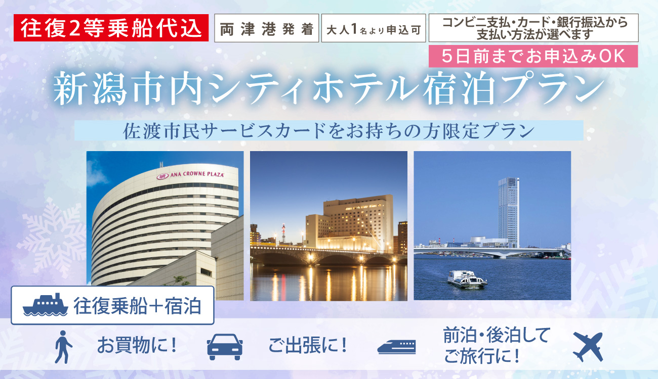 【佐渡発/島民限定】新潟市内シティホテル宿泊プラン【2026年1月~2026年3月】 宿泊型プラン 両津港 佐渡市民サービスカードをお持ちの方限定の、特別なお得プランをご用意しました。 【プラン内容】 両津港発 カーフェリー 島発往復きっぷ〈2等往復〉 + 新潟市内シティホテル 1泊(素泊まり) 【設定期間】2026年1月9日(金)~3月30日(月)※一部設定除外日あり※最大6泊7日まで利用可能(宿泊最終日:3/30、復路最終日:3/31) 【対象】佐渡市民限定プラン佐渡市民サービスカードをお持ちの方が対象です。 【旅行代金】大人:11,800~12,900円小児:9,800~10,900円 お知らせ 2025年12月24日更新 2026年1月5日~2月27日の新潟~両津航路カーフェリーは、年次点検(船舶整備)に伴う 1隻運航体制となります。2026年カーフェリー1隻運航体制時の車両予約について | 佐渡汽船公式サイト 1/9(金)~2/27(金)はカーフェリー1隻運航のため、往路7:20発ジェットフォイルを差額なしでご利用いただけます。往路7:20便をご利用の場合、復路は1/10(土)~2/28(土)の期間内でご希望の便をご選択いただけます(要予約) 【ホテル宿泊/設定除外日】 ■ホテル日航新潟1月:12(月)|17(土)|18(日)|24(土)2月:7(土)|21(土)|22(日)3月:6(金)|7(土)|8(日)|20(金)|21(土) ■ANAクラウンプラザホテル新潟3月:7(土)|20(金) ■ホテルオークラ新潟1月:17(土)|18(日)2月:7(土)|21(土)3月:7(土)|19(木)|20(金)|21(土) 選べるホテル①ANAクラウンプラザホテル新潟 お部屋一例 ANAクラウンプラザホテル新潟 新潟市の中心地、万代地区に位置するANAクラウンプラザホテル新潟は、交通の利便性もよく、ビジネスや観光の拠点として快適な環境をご提供いたします。 ANAクラウンプラザホテル新潟【公式サイト】|(anacrowneplaza-niigata.jp) 〒950-8531 新潟市中央区万代5-11-20 TEL: 025-245-3333 チェックインタイム 14:00 チェックアウトタイム 11:00 目的地所要時間万代シティ バスセンタービル徒歩:約6分ラブラ万代徒歩:約5分佐渡汽船 新潟港タクシー:約5分バス利用:約10分新潟駅タクシー:約5分徒歩:約10分 選べるホテル②ホテルオークラ新潟 お部屋一例 ホテルオークラ新潟 信濃川と萬代橋を眺めながら、開放感あふれるひとときを。新潟の四季折々の素材をいかした料理、シックな趣のバーなど、最上のサービスとともにお楽しみいただけます。繁華街や本町市場、新潟駅・新潟空港へのアクセスにも便利です。 ホテルオークラ新潟【公式サイト】|(okura-niigata.co.jp) 〒951-8053 新潟市中央区川端町6-53 TEL: 025-224-6111 チェックインタイム 14:00 チェックアウトタイム 11:00 ※チェックインのお時間が24時以降になる場合は、ご連絡くださいますようお願い申し上げます。(TEL025-224-6111) 目的地所要時間万代シティ バスセンタービル徒歩:約10分ラブラ万代徒歩:約10分タクシー:約5分バス:約6分佐渡汽船 新潟港タクシー:約7分徒歩:約25分新潟駅バス:約6分タクシー:約5分徒歩:約15分 選べるホテル③ホテル日航新潟 お部屋一例 ホテル日航新潟 国際交流拠点「新潟コンベンションセンター(朱鷺メッセ)」に併設するホテル。北欧スカンジナビアデザインを基調に、建物全体が客船に見立てられています。眺望の良い客室、レストラン、地上120mに位置するスカイバンケットなど、充実した宴会施設等もあり、宿泊だけにはとどまらない、新潟のランドマークです。 ホテル日航新潟【公式サイト】|(hotelnikkoniigata.jp)〒950-0078 新潟県新潟市中央区万代島5番1号TEL:025-240-1888 ・チェックインタイム 14:00・チェックアウトタイム 11:00 目的地所要時間万代シティ バスセンタービル徒歩:約16分バス:約9~17分ラブラ万代徒歩:18分バス:約9~20分佐渡汽船 新潟港タクシー:約5分徒歩約7~8分新潟駅バス:約15分タクシー:約8分徒歩:約25分 プラン特価!オプション車両航送 車両航送 旅の自由が広がるマイカー航送を、特別料金〈17,800円〉でご利用いただけます。 乗用車1台:17,800円 (車長3m以上6m未満の乗用車対象。ページ下部のご注意で対象となる車種をご確認ください) 設定期間 2026年1月9日(金)~3月30日(月)※2026年3月30日(月)以降の延泊設定日はありません。※最大6泊7日まで延長可能です。※カレンダーの色分けは宿泊日を基準にしております。 期間区分A期B期設定期間外 宿泊1日目(宿泊日初日)に選んだ日付が、基本代金の適用基準日となります 1月 日月火水木金土12345678910111213 141516171819202122232425262728293031 2月日月火水木金土12345678910111213141516171819202122232425262728 3月日月火水木金土12345678910111213141516171819202122232425262728293031 基本代金/1~3名1室1名あたり/税込A期大人11,800円小児9,800円B期大人12,900円小児10,900円 ※小児の方は、大人の方と同室で 2名1室以上よりご利用いただけます。 延泊代金/1~3名1室1名あたり/税込A期大人8,800円小児8,800円B期大人9,900円小児9,900円 ※小児の方は、大人の方と同室で 2名1室以上 よりご利用いただけます。 【ご予約前に必ずご確認ください】 ■車両航送をご希望のお客様へ 車両航送は 事前に車両航送の空き状況をご確認の上 お申し込みください。▶ 空き状況はこちら:https://www.sadokisen.co.jp/reservation/seat-availabil