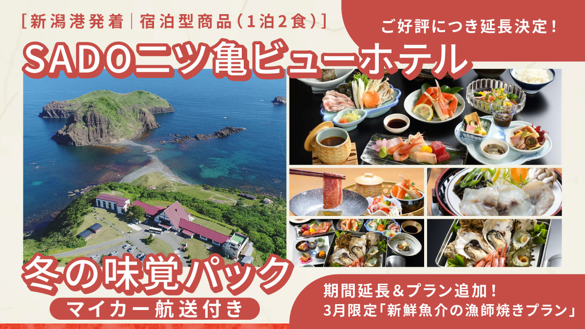 SADO二ツ亀ビューホテル冬の味覚パック【マイカー航送付き】 宿泊型プラン 新潟港 ご好評につき期間延長!3月限定「新鮮魚介の漁師焼きプラン」登場 佐渡最北端、絶景の二ツ亀を望むホテルで、ゆったりとした冬のひとときをお過ごしください。 セット内容(大人2名様) 往復乗船代 (カーフェリー2等自由席) 宿泊 (SADO二ツ亀ビューホテル・1泊2食) マイカー航送(普通車1台・往復) 選べるプラン 基本懐石プラン(和食膳) 【終了/12月限定】寒ぶり懐石プラン(基本懐石+寒ぶり・ぶりしゃぶ) 【1月~2月限定】佐渡牛の牛しゃぶ懐石プラン(基本懐石+佐渡牛のしゃぶしゃぶ) 【1月~2月限定】ふぐちり懐石プラン(基本懐石+ふぐちり) 【3月限定】新鮮魚介の漁師焼きプラン(基本懐石+漁師焼き) レンタカーをご希望の方はこちら↓SADO二ツ亀ビューホテル 冬の味覚パック【レンタカー付き】 選べる夕食・懐石プラン 漁師焼き懐石イメージ 漁師焼きイメージ(2名分) 基本懐石イメージ 選べる懐石プラン 【全期間】基本懐石プラン(和食膳)1期:46,800円 ~ 2期:48,800円 【終了/12月限定】寒ぶり懐石プラン基本懐石+寒ぶり・ぶりしゃぶ1期:50,800円 ~ 2期:52,800円 【1月~2月限定】佐渡牛しゃぶ懐石プラン基本懐石+佐渡牛しゃぶしゃぶ1期:50,800円 ~ 2期:52,800円 【1月~2月限定】ふぐちり懐石プラン基本懐石+ふぐちり1期:50,800円 ~ 2期:52,800円 【3月限定】新鮮魚介の漁師焼きプラン基本懐石+漁師焼き50,800円 ※本プランは全体的にボリュームがあるため、漁師焼きは大人の方のみのご提供となります。※小学生以下のお子様は、基本懐石プランと同内容・同料金でのご案内となります。 注意事項※料金は大人2名様、1期(通常代金)~2期(年末年始12/31~1/1)の変動料金です。※料金には大人2名様分の乗船・宿泊・レンタカー代が含まれます。※追加料金で3名様以上もご利用いただけます。※夕食メニューはグループ全員同じ内容でご用意いたします。(1回のお申込みにつき1グループとなります)※写真はイメージです。 ホテルでゆったり過ごす 二ツ亀ビューホテル スーペリアツイン(最大定員4名) ゆったりとした冬のひととき。 お部屋のご案内 全室オーシャンビュー&シモンズベッド完備 洋室おまかせ(基本はツイン) 3~4名様の場合:ツイン+エキストラベッドまたはソファーベッドで対応 マイカーの車両航送がセット 車両航送イメージ 佐渡島内もマイカーで自由に♪ マイカー航送(車両航送)のご案内 対象車種:車検証に記載の、車長3m以上6m未満の乗用車(ワゴン車含む) ※車検証に規定するトラック・貨物車は対象外です。 ※復路は最大5日目まで選択できます。(1泊目の宿泊が条件です) 満点の星空に感動 ホテル周辺は明かりが少ないため、夜、条件が良ければ満天の星空が見られます。 防寒対策をばっちりにして冬の天体観測をお楽しみください。 プラン概要 プラン名 SADO二ツ亀ビューホテル 冬の味覚パック【マイカー航送付き】 お知らせ ★島内の観光地やお土産処で提示すると、入館や買物時に割引等の特典が受けられる「佐渡・新潟観光施設割引証」のおまけつき★ 【復路の選択について】 ・復路は出発日から最大5日目まで選択できます。(1泊目の宿泊が条件です) ・延泊は宿泊設定日の範囲内で選択可能です。 ・宿泊設定日以外の宿泊については、お客様ご自身にてお手配ください。 出発設定日 2025年12月20日(土)~2026年2月28日(土)の土曜日、および2月22日、2026年3月1日(日)~3月31日(火) 出発地 佐渡汽船 新潟港ターミナル 旅行代金 ■基本旅行代金(大人2名様+マイカー1台航送) 基本懐石プラン(和食膳) 1期(通常):46,800円 2期(年末年始 12/31~1/1):48,800円 【終了/12月限定】寒ぶり懐石プラン 1期(通常):50,800円 2期(年末年始):52,800円 【1月~2月限定】佐渡牛しゃぶ懐石プラン 1期(通常):50,800円 2期(年末年始):52,800円 【1月~2月限定】ふぐちり懐石プラン 1期(通常):50,800円 2期(年末年始):52,800円 【3月限定】新鮮魚介の漁師焼きプラン 50,800円 ■追加代金(3名様以上の場合) 基本懐石プラン 大人1名: 1期 14,900円/2期 15,900円 小児1名: 1期 9,400円/2期 10,400円3月共通 大人1名: 14,900円3月共通 小児1名: 9,400円 佐渡牛・ふぐちり・漁師焼き 懐石プラン 大人1名: 1期 16,900円/2期 17,900円 小児1名: 1期 10,800円/2期 11,400円3月共通 大人1名: 16,900円3月共通 小児1名: 9,400円 ■延泊代金(1名あたり) 基本懐石プラン 大人1名: 1期 9,800円/2期 10,800円 小児1名: 1期 6,860円/2期 7,560円3月共通 大人1名: 9,800円3月共通 小児1名: 6,860円 佐渡牛・ふぐちり・漁師焼き 懐石プラン 大人1名: 1期 11,800円/2期 12,800円 小児1名: 1期 8,260円/2期 8,960円 3月共通 大人1名: 11,800円3月共通 小児1名: 6,860円 ・小児は6歳~12歳の小学生が対象です。(中学生は大人料金となります) ■カーフェリー等級変更差額(追加料金) <新潟航路> 2等→1等: 大人 1,440円/小児 720円 ※きっぷうりば窓口、またはカーフェリー船内案内所で等級変更する場合は、上記料金ではなく通常運賃との差額をお支払いください。 ■幼児について 幼児代金はお宿でのお支払いとなります。 0~2歳で食事・寝