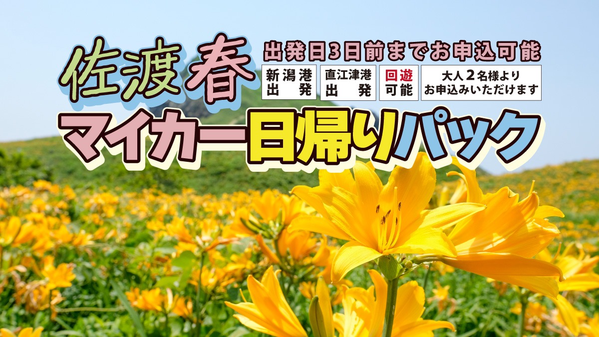 佐渡マイカー日帰りパック2026【4月~6月】 日帰り型プラン 新潟港, 直江津港 好評の佐渡マイカー日帰りパック!基本プランの車両1台+大人2名で30,000円~31,000円。通常の代金より、ぐっとお得にご利用いただけるプランです。また、島内の観光地やお土産処で提示すると、入館や買物時に割引等の特典が受けられる「佐渡・新潟観光施設割引証」のおまけつき。 ぜひ、お出かけにご利用ください! 【設定期間:2026年4月4日(土)~6月28日(日)/土日祝日限定/※一部除外日あり】 ※除外日:4月26日(日)、5月16日(土)~5月17日(日) ご予約は、当ページ最下部「予約へ進む」ボタンよりお進みください。 ※すでにパック内容をご存知の方は、下の「今すぐ予約する」ボタンよりご予約いただけます。 佐渡マイカー日帰りパック2026【4月~6月(GWを除く)】を「今すぐ予約する」 佐渡マイカー日帰りパック2026【ゴールデンウイーク限定】を「今すぐ予約する」 新潟港、直江津港、発着港自由!回遊が可能です! 出発港は 新潟港でも直江津港でもOK!帰着港も 新潟港でも直江津港でもOK!回遊利用もできます!(直江津~小木航路は便数が少ないのでご注意ください) ※回遊でのご利用は、直江津-小木航路の運航期間のみ可能です。 「佐渡・新潟観光施設割引証」付き! 佐渡には魅力的な観光地がたくさんあります。「佐渡・新潟観光施設割引証」でオトクに佐渡を楽しもう♪ 割引証があるとこんなに便利!たとえば…●佐渡歴史伝説館の入館料が10%OFF●観光地の売店でお買い物5%OFF●絶対乗りたい!たらい舟も50円OFF…などなどお得な特典が盛りだくさん! 「佐渡・新潟観光施設 割引証」対象施設と特典一覧表 サンプルコース 日帰り旅行サンプルコース (往復 新潟港~両津港 利用) 【新潟港 8:45頃 到着】 ▽ 「のりば食堂しおさい」「トキめき館(ヤマザキショップ)」紹介ページ 新潟港3階カーフェリーのりば「のりば食堂しおさい」はAM7:00からの営業新潟港3階カーフェリーのりば「トキめき館(ヤマザキショップ)」はAM7:00から営業 ▽ 【新潟港 9:25 出航】 ⌇⌇ 船内には売店がなく、自販機コーナーのみ。⌇ 【両津港 11:55 着船】 ・maSanicoffee(マサニコーヒー/カフェ)・マサニコーヒーの佐渡食材・期間限定メニュー等は公式Instagramからご覧ください maSanicoffee マサニコーヒー(@masanicoffee_sado) • Instagram写真と動画 ・両津港1階maSanicoffeeは6:30から営業・周辺に飲食店も数店舗あり。その日によって営業時間などが違うため、事前確認要 ・周辺飲食店(さど観光ナビ)・周辺飲食店(食べログ)・周辺飲食店(Tripadviser) ▽ 【12:00~ 昼食】 一例)・いしはら寿司(両津夷192-2/いしはら寿司 – 佐渡市その他/寿司 | 食べログ)にてお寿司・mikawa(春日176-3/ミカワ (mikawa) – 佐渡市その他/カフェ | 食べログ)で軽食・餃子&珈琲 おにCafé(両津湊110/おにCafe(@onicafe_sado) • Instagram写真と動画)で軽食・caMoco café 湖ASOBi(カモコ カフェ こアソビ/原黒553-28/caMoco cafe 湖ASOBi/新潟/佐渡市/佐渡島/カフェ(@camoco_cafe) • Instagram写真と動画)でパスタ等のランチ 【13:00 出発】 ▽ 【トキの森公園(公式) 13:20頃 到着】 トキの暮らす自然環境を再現した大型ケージに、資料館、トキの近縁種の飼育など、トキの生態と自然復帰を研究している施設 【14:00頃 出発】 ▽ 【佐渡西三川ゴールドパーク(公式) 14:35頃 到着】 砂金採り体験で取れた砂金はお持ち帰り可能♪その場でパウチやキーホルダーに加工もできます♪(別途追加代金)混雑が避けられるので、事前にTEL予約がオススメ♪ 【15:25頃 出発】 ▽ 【佐渡金山 16:05頃 到着】 画像は佐渡金山絵巻に描かれている採掘作業を忠実に再現した宗太夫坑。道遊坑と宗太夫坑の2坑あり、通年坑内の気温は10度!(金山坑内で熟成させたお酒が、島内のお土産ショップに並んでいることがあります!) 【佐渡金山 17:15頃 出発】 ▽ 【両津港 18:15頃 到着】 ・両津港周辺で早めのご夕食 ・周辺飲食店(さど観光ナビ)・周辺飲食店(食べログ)・周辺飲食店(Tripadviser) ▽ 【両津港 19:30 出航】 ⌇⌇⌇・天候が良好な日は、夜空が綺麗⌇ 【新潟港 22:00 着船】 ※新潟港「のりば食堂しおさい」は営業終了19:15、「トキめき館(ヤマザキショップ)」は19:30までの営業です。夕食は両津港出航前に済ませることをオススメします。 日帰り旅行サンプルコース (往復 直江津港~小木港 利用) 【直江津港 到着 6:20頃】 ・直江津港では食堂ながもが早朝6:00から営業 ・食堂ながも(公式) ▽ 【直江津港 7:10 出航】 ⌇⌇ 船内には売店がなく、自動販売機コーナーのみ⌇ 【小木港 9:30 着船】 ・小木港隣接の小木家(公式)、お土産売店9:00~営業、レストラン11:00~営業 ・ほか飲食店は少し離れた場所にあり。その日によって営業時間などが違うので、事前確認要・飲食店紹介(食べログ) ▽ 【宿根木(公式) 9:45頃 到着】 佐渡金山が栄えた17世紀を経て、北前船の寄港地として発展した小木海岸の入り江の集落。今も100棟を超える板壁の民家が密集し、国の重要伝統的建造物群保存地区でもあります。 【宿根木 10:30頃 出発】 ▽ 【佐渡西三川
