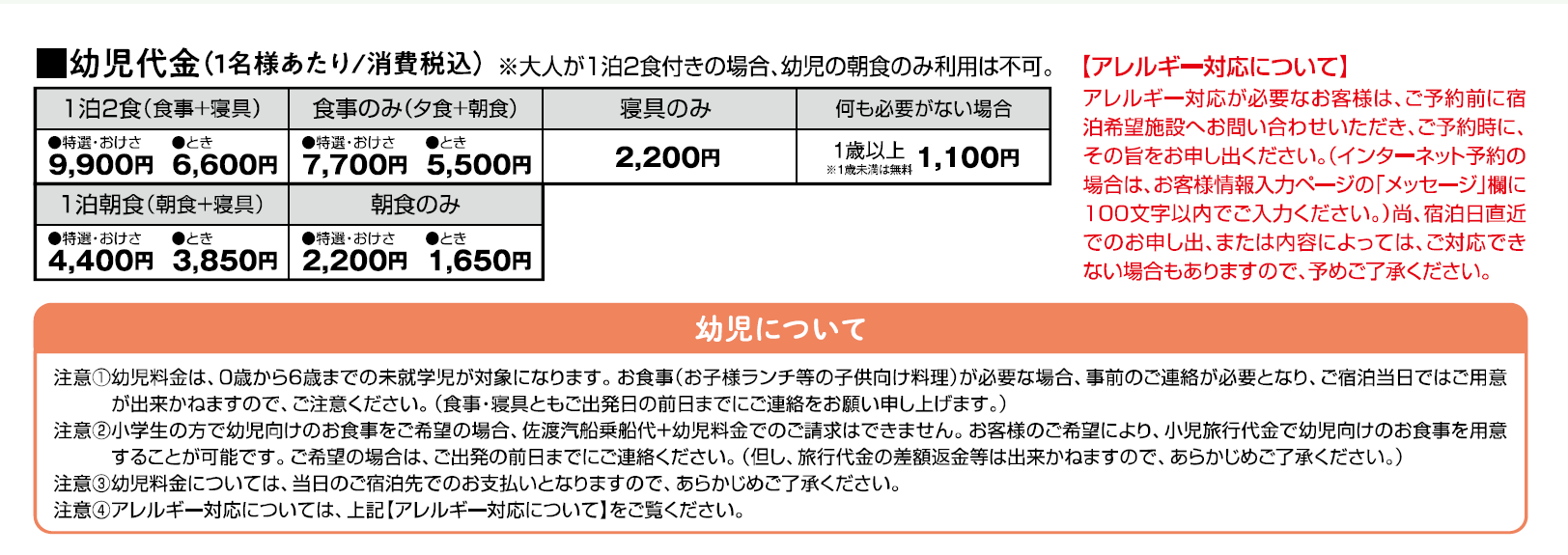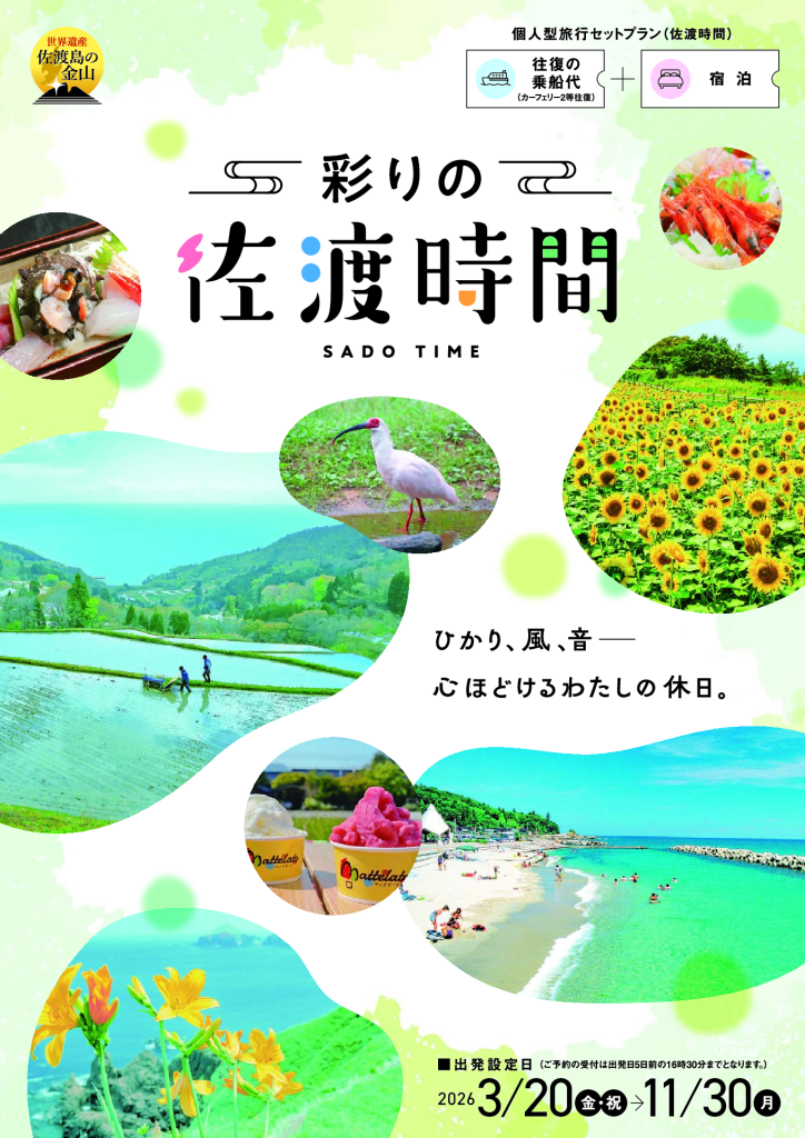 彩りの佐渡時間(発売開始前) 宿泊型プラン 新潟港, 直江津港 心ほどけるわたしの休日。 設定期間:2026年3月20日(金)~11月30日(月) 「往復の乗船代(カーフェリー2等)」+「宿泊」をベースに、オプションで車両航送、島内レンタカー、貸切観光タクシーを組み合わせてお申込みいただける、個人向けの旅行セットプランです。 一つのご予約で、佐渡島内の宿泊と交通をまとめて手配。旅の準備はシンプルに、佐渡で過ごす時間はゆったりと。佐渡の景色や風、波音を感じながら、思い思いのペースで「佐渡時間」をお楽しみください。 お知らせ 2月4日(水)更新 佐渡時間は、2月5日(木)10:00より予約受付を開始予定です。 パンフレットはこちら > 彩りの佐渡時間 パンフレット 春のおすすめスポット 佐渡金山の桜並木 大野亀のトビシマカンゾウ 三太郎農園のバラ園 4月中旬 佐渡金山の桜並木 江戸時代から続く歴史的な金山遺跡に、約400本の桜が咲き誇ります。国指定史跡「道遊の割戸」と桜のコラボレーションは圧巻で、夜間のライトアップも見事です。 5月下旬 大野亀のトビシマカンゾウ 二つ星の景勝地として名高い大野亀。5月末には黄色いトビシマカンゾウが一面に咲き、雄大な日本海の青色と絶妙なコントラストを描きます。 6月上旬 三太郎農園のバラ園 500品種・つるバラを中心に600株もあるバラの華やかな色や香りを楽しむことができます。見ごろは5月20日過ぎ~6月中旬。フォトジェニックな園内で優雅なひとときを過ごしに来ませんか。 ※花の見ごろは年によって異なります。掲載時期はあくまでも目安となります。 全20施設から、お好みのお宿を選択♪ ホテルタイプのベッドのお部屋から、和室の温泉旅館まで、佐渡汽船が自信をもっておすすめできるお宿をご用意しました。 画像/佐渡二ツ亀ビューホテル・客室2024年3月1日全面リニューアルオープン!オープンデッキを新設し、ロビーやお部屋も機能的に一新しました! 島旅をもっと快適に。追加オプション 車両航送 【往復または回遊/1台】 19,800円 ※車長3m以上6m未満の乗用車・ワゴン車が対象※トラック・貨物車は不可 島内レンタカー、貸切観光タクシーもお選びいただけます。料金など詳細はパンフレットをご確認ください。 島内の観光施設やお土産処で使える「佐渡・新潟観光施設割引証」付き 佐渡には魅力的な観光地がたくさんあります。「佐渡・新潟観光施設割引証」でオトクに佐渡を楽しもう♪ 割引証があるとこんなに便利!たとえば…●佐渡歴史伝説館の入館料が10%OFF●観光地の売店でお買い物10%OFF●絶対乗りたい!たらい舟も50円OFF…などなどお得な特典が盛りだくさんです。 「佐渡・新潟観光施設 割引証」対象施設と特典一覧表割引証は乗船きっぷ発券時、同時に発行されます。 宿泊先一覧 ■両津地区■ 湖畔の宿 吉田家 【おけさコース】 朱鷺伝説と露天風呂の宿 きらく 【ときコース】 夕日と湖の宿 あおきや 【ときコース/朝食のみOK/一人旅OK】 ホテルニュー桂 【ときコース/朝食のみOK】 みなみ旅館 【ときコース/朝食のみOK】 ■外海府地区■ SADO二ツ亀ビューホテル 【特選コース】 【おけさコース】 【ときコース】 国民宿舎 海府荘 【ときコース/朝食のみOK】 旅荘 みなと 【ときコース】 ■小木・赤泊地区■ 御宿 花の木 【おけさコース/一人旅OK】 御宿 おぎの湯 【おけさコース/朝食のみOK/一人旅OK】 旅館 かもめ荘 【ときコース/朝食のみOK/一人旅OK】 サンライズ城が浜 【ときコース/一人旅OK】 ■相川地区■ 伝統と風格の宿 ホテル万長 【特選コース】 【おけさコース/朝食のみOK】 SADO RESORT HOTEL AZUMA 【特選コース/朝食のみOK】 【おけさコース/朝食のみOK】 HOTEL OOSADO 【特選コース】 ホテルファミリーオ佐渡相川 【おけさコース/一人旅OK】 【ときコース/朝食のみOK/一人旅OK】 民宿敷島荘 【おけさコース/朝食のみOK/一人旅OK】 いさりびの宿 道遊 【ときコース/朝食のみOK/一人旅OK】 ■真野湾地区■ 旅館 入海 【ときコース】 国際佐渡観光ホテル 八幡館 【特選コース】 【おけさコース】 【ときコース/朝食のみOK/一人旅OK】 【特選コース】 特選コースの1泊2食利用が可能です。 【朝食のみOK】 特選コースの朝食のみ(1泊朝食)利用が可能です。 【おけさコース】 おけさコースの1泊2食利用が可能です。 【朝食のみOK】 おけさコースの朝食のみ(1泊朝食)利用が可能です。 【一人旅OK】 おけさコースの一人旅(1名1室)利用が可能です。 【ときコース】 ときコースの1泊2食利用が可能です。 【朝食のみOK】 ときコースの朝食のみ(1泊朝食)利用が可能です。 【一人旅OK】 ときコースの一人旅(1名1室)利用が可能です。 プラン概要 プラン名 彩りの佐渡時間(発売開始前) お知らせ ご予約受付開始は2月5日(木)10:00~を予定しております。 出発設定日 2026年3月20日(金)~11月30日(月)出発 出発地 新潟港 / 直江津港 旅行代金 ≪基本旅行代金≫ 往復乗船代(カーフェリー2等)+宿泊代(1泊2食) 1名様あたり/2名様以上1室利用/消費税・入湯税込 [特選コース] 大人:旅行代金 27,500円~